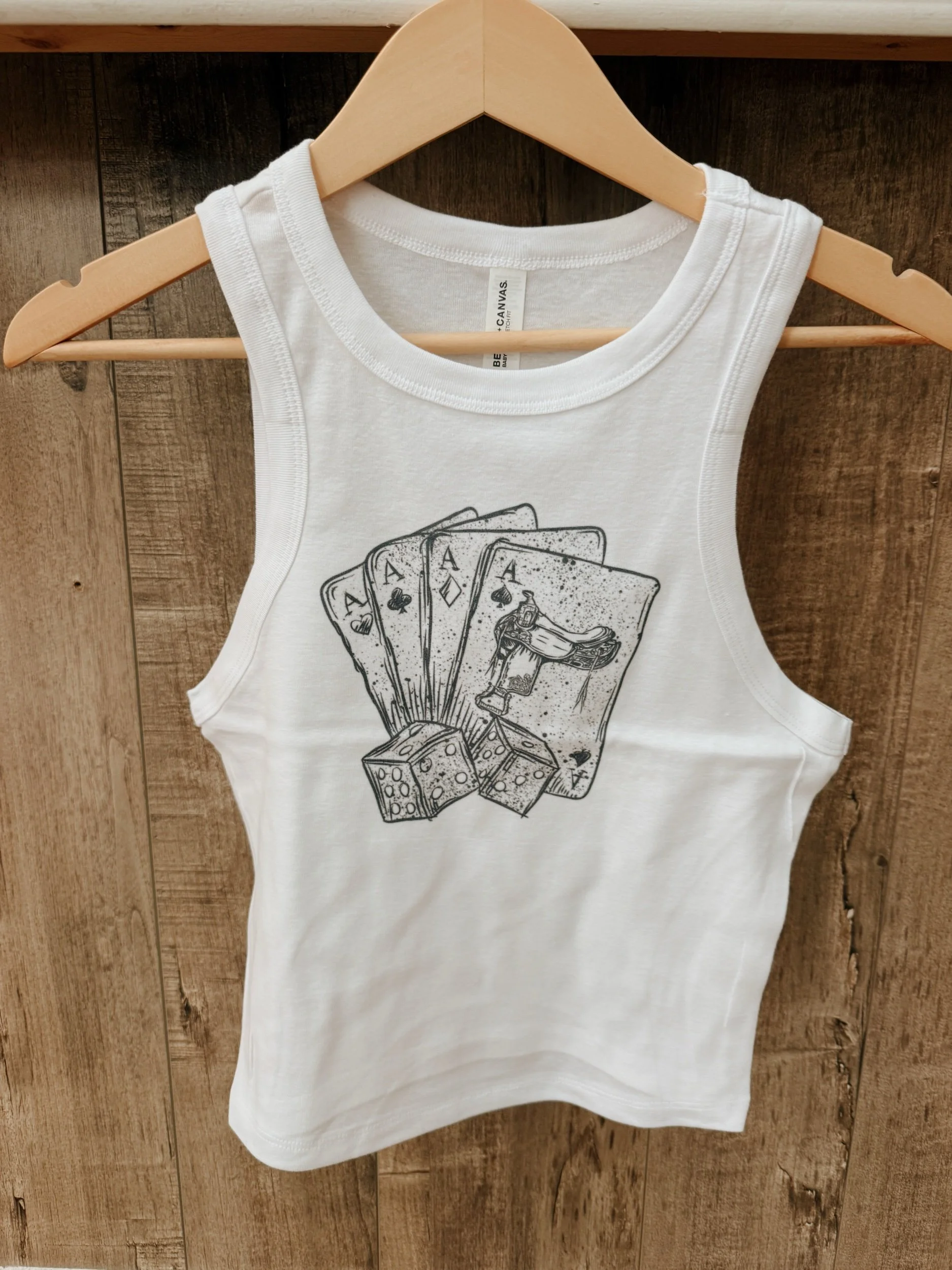 Image 1 of 1 Ace Tank $36.00 Cotton and polyester blend Size: Small Medium Large Add To Cart Added! Cotton and polyester blend You Might Also Like Camo Darlin’ Tee $34.00 Cowboys Cropped Tank $36.00 Pink 3/4 Sleeve T-Shirt $34.00 Black Open-Back Tee $35.00 Khaki 3/4 Sleeve T- Shirt $34.00